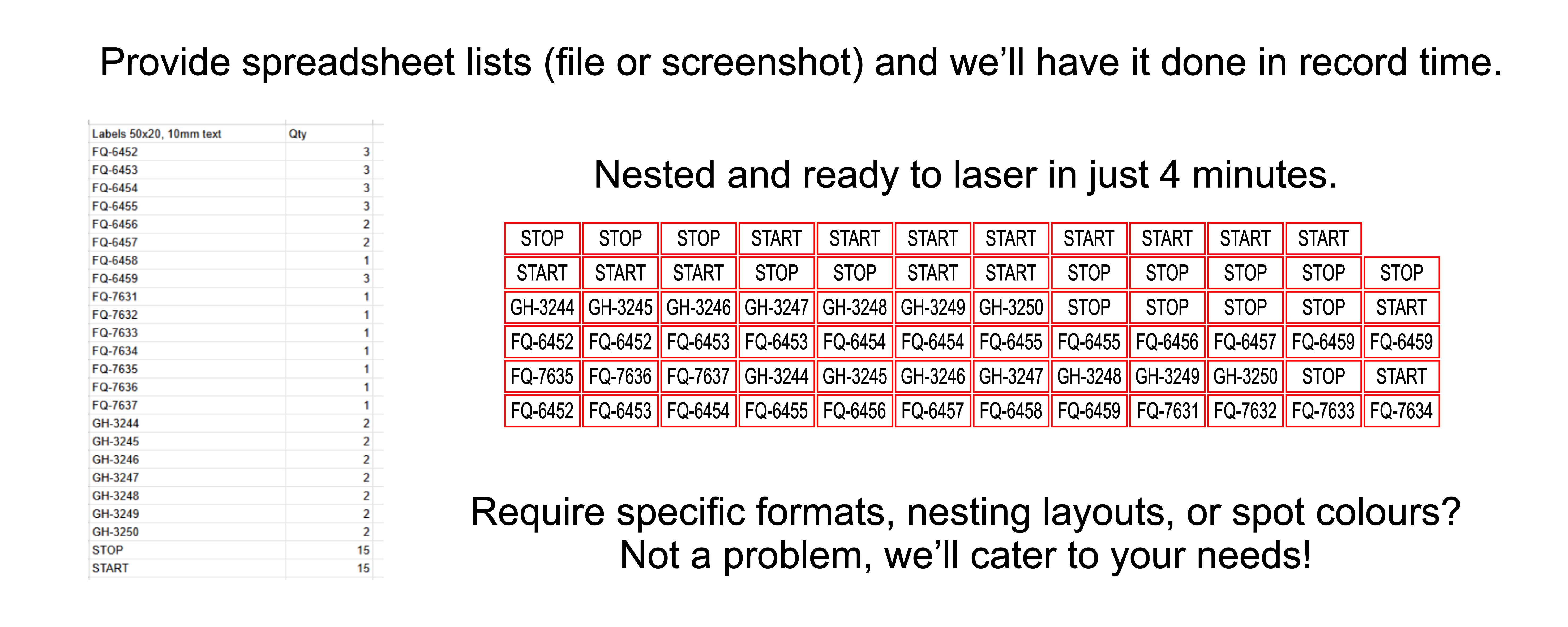 Spreadsheet lists are the most practical form of ordering items that need typesetting, as they offer the unique advantage of print-merging; a software process that automates typesetting. However, print-merging can still take time to set up and may not always be the fasted solution.
